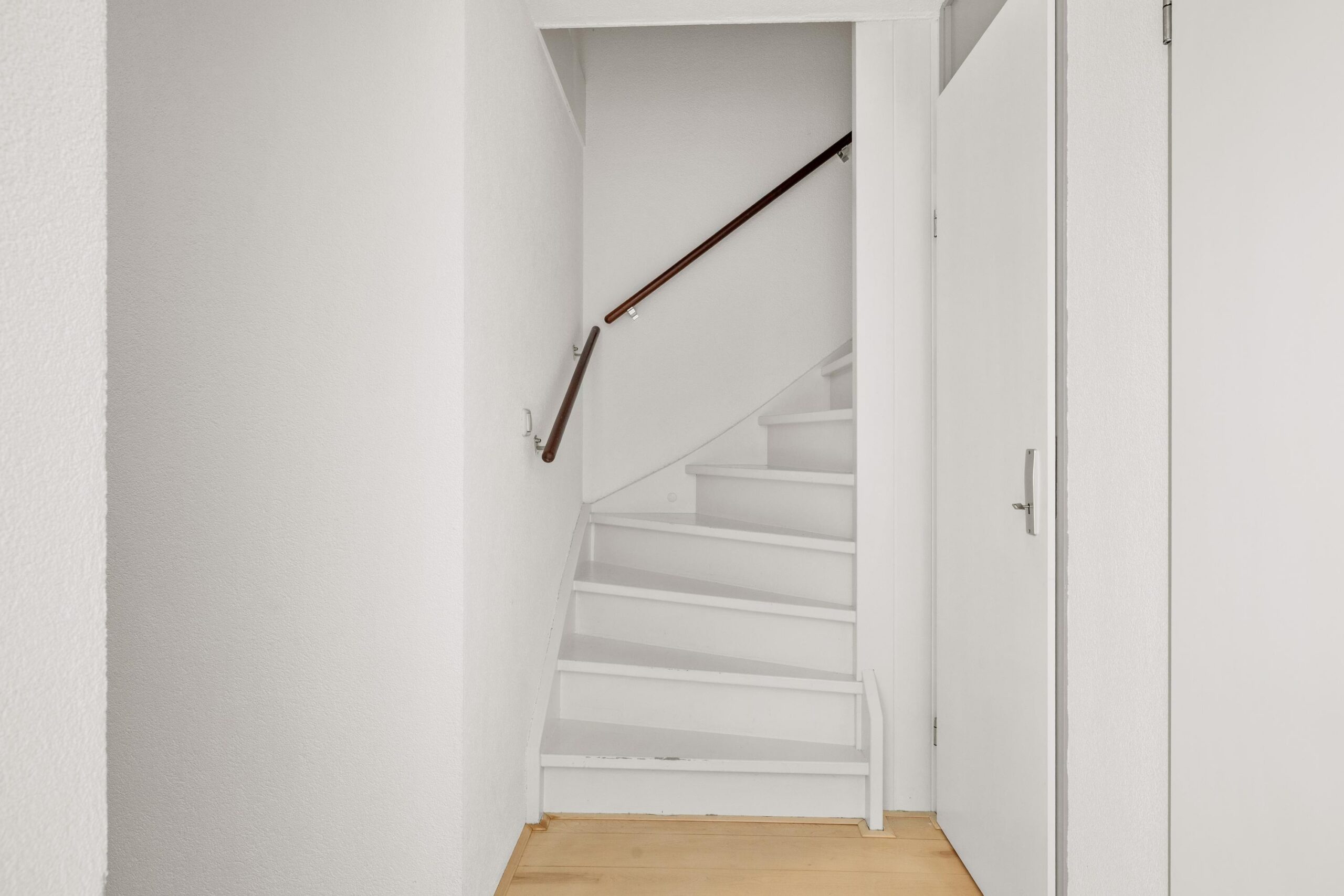 Eerste woonlaag: je komt binnen in de hal met meterkast, toiletruimte, trapopgang en een praktische inpandige berging. Aangrenzend bevindt zich de royale woonkamer met vide, hoge raampartijen en een schuifpui naar het zonnige balkon.