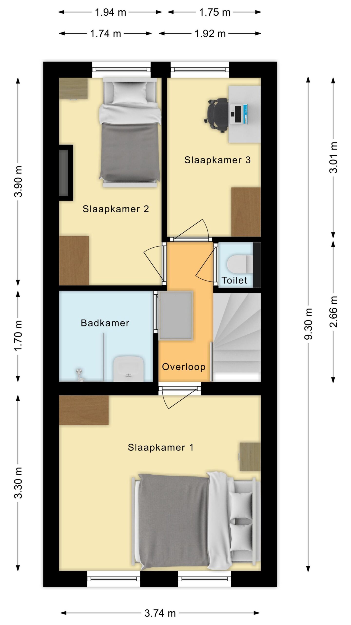 Via de trap komen we op de overloop van eerste verdieping met toegang tot de 3 slaapkamers, badkamer en separaat 2e toilet. Hier een nette laminaat vloer en gestucte wanden en plafonds. Aan de voorzijde een royale slaapkamer met genoeg ruimte voor een groot 2-persoonsbed en een royale kledingkast. De grote kunststof draai/kiepramen zorgen veel daglicht en een prettig uitzicht.