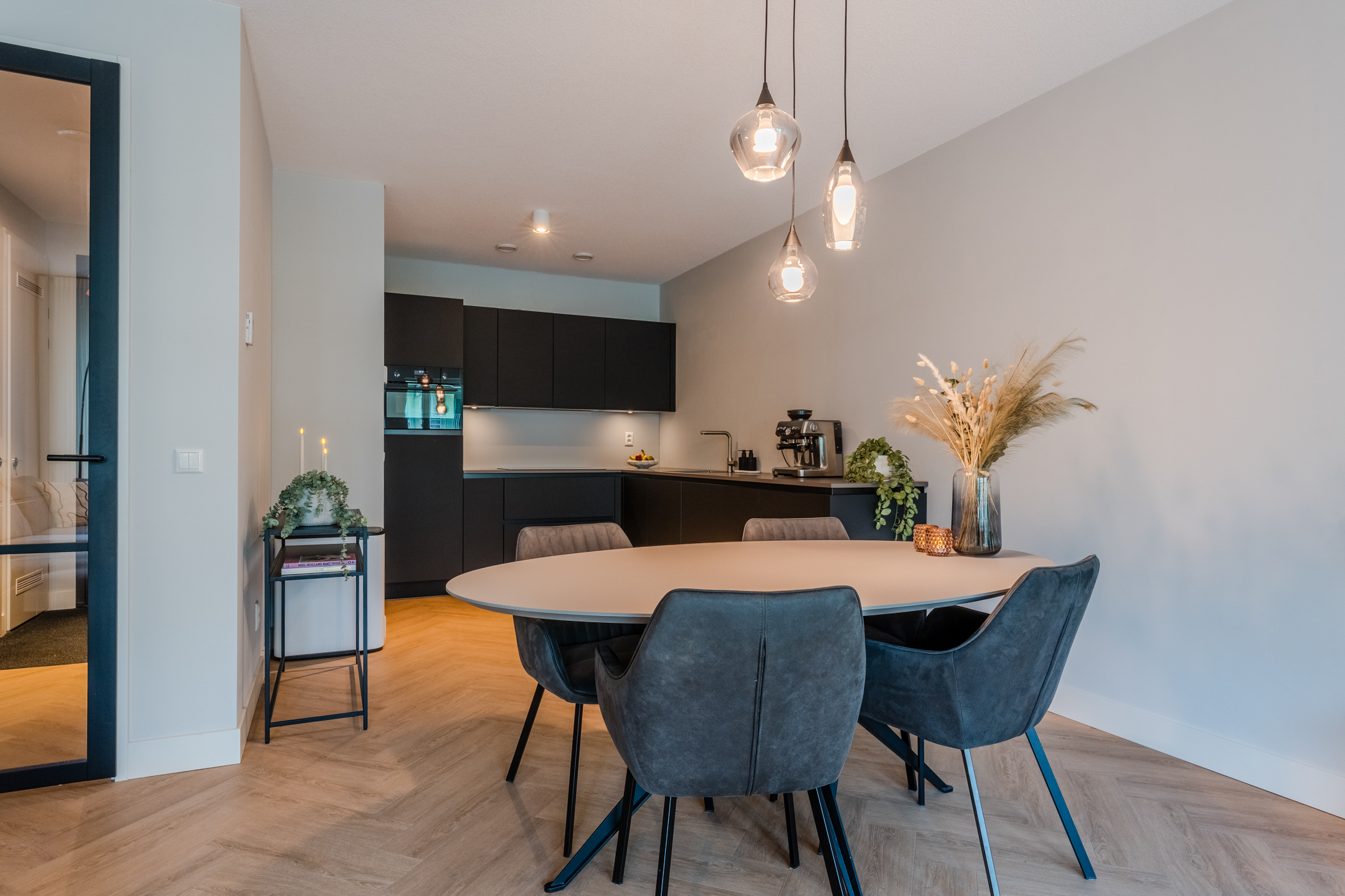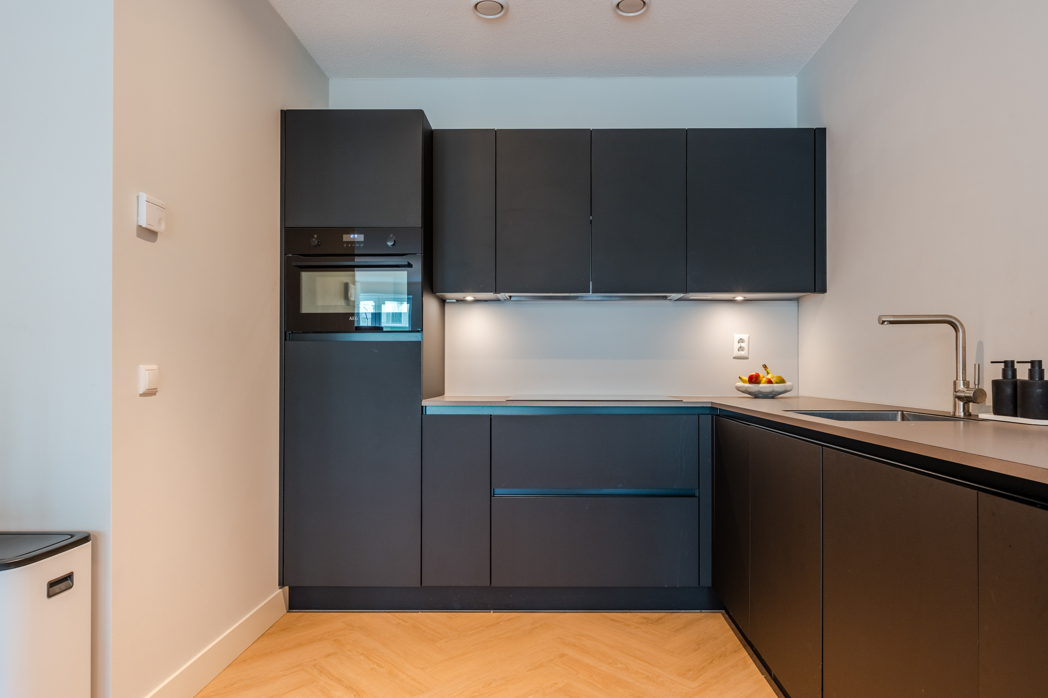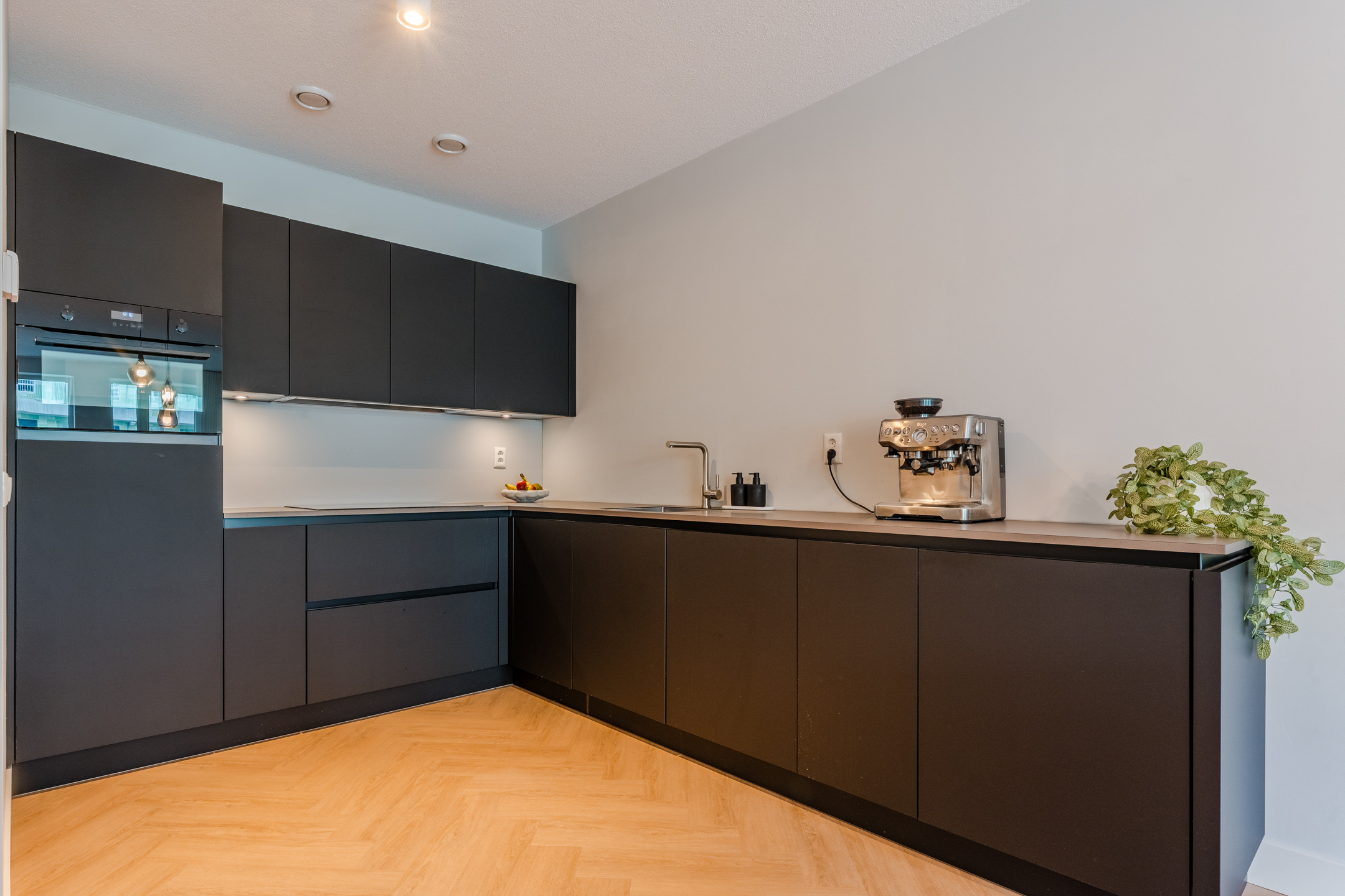 Terug in de woning bekijken we de moderne open keuken (Keller) in praktische hoekopstelling. De keuken is volledig uitgerust met hoogwaardige inbouwapparatuur, waaronder een inductiekookplaat, koelkast, vriezer, combimagnetron en vaatwasser. Dankzij de royale werkruimte is deze keuken niet alleen stijlvol, maar ook uiterst functioneel.