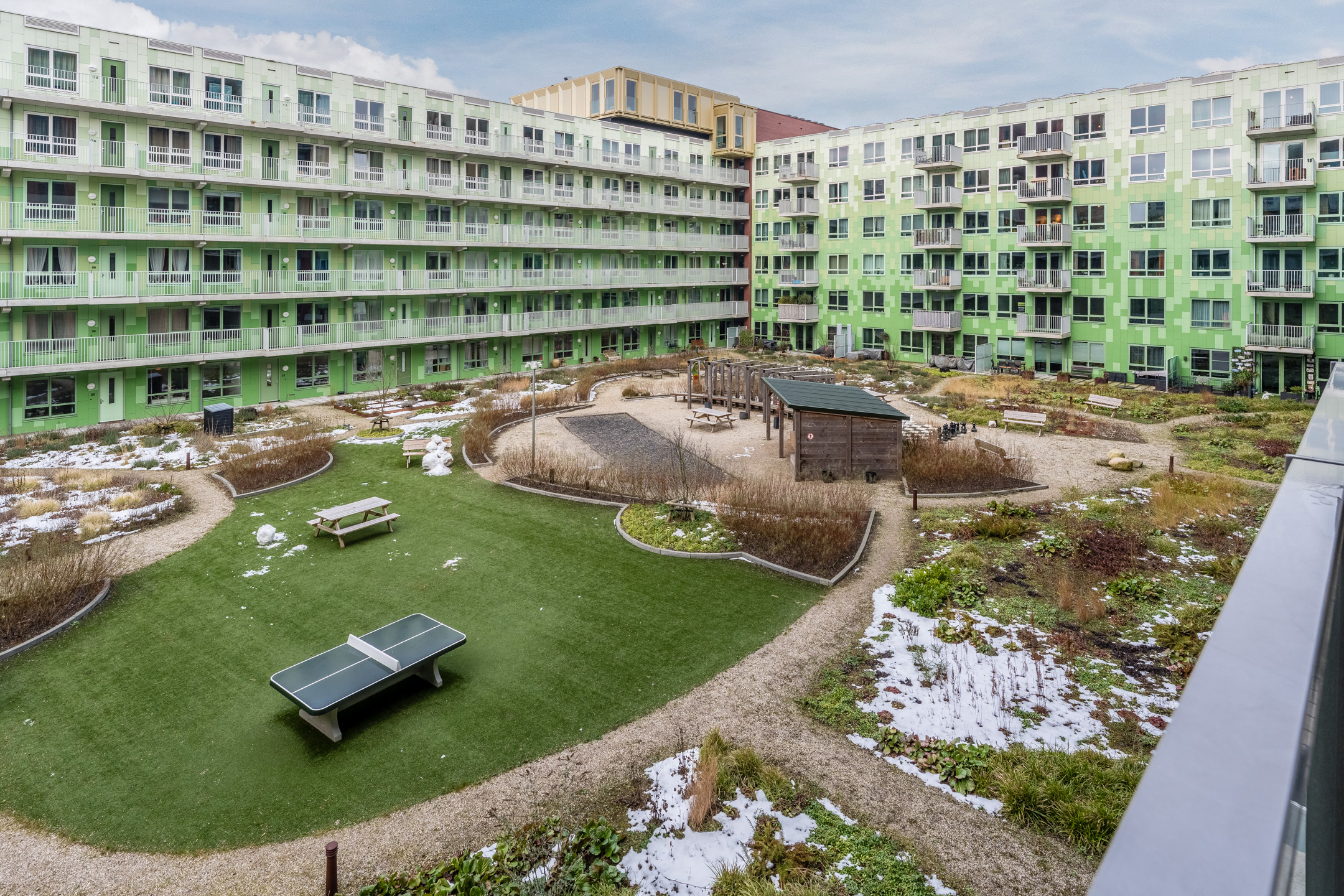 Het op het noordwesten gelegen balkon vormt een rustige buitenruimte waar u ’ s zomers heerlijk kunt genieten van de zon en van het uitzicht op de fraai aangelegde gemeenschappelijke binnentuin.